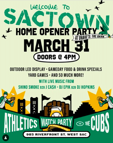 Whether you’re a die-hard A’s fan or just here for the vibes, Opening Day at Drake’s is the place to be. Deck yourself out in green and gold, grab your friends, and get ready to celebrate baseball, Sacramento-style.