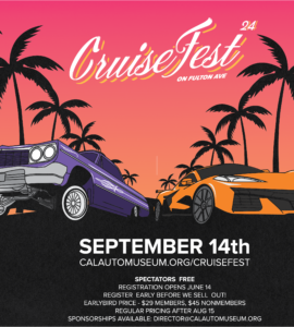 They’re back for the annual CruiseFest on Fulton Avenue, FREE to the attending public and benefitting the California Automobile Museum (from the paid entries of those showing their cars). This...