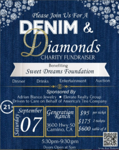 The Sweet Dreams Foundation, a beacon of hope for families facing unimaginable challenges with their medically fragile children, is the heart of this event. The foundation, based in Folsom, CA, has made it its mission to spread peace, hope, and love, especially in times when families need it most. The Denim & Diamonds Gala will feature: